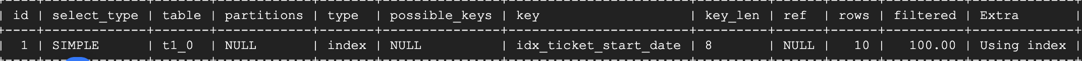- 인덱스 idx_ticket_start_date가 제대로 활용되어 수행되고 있음