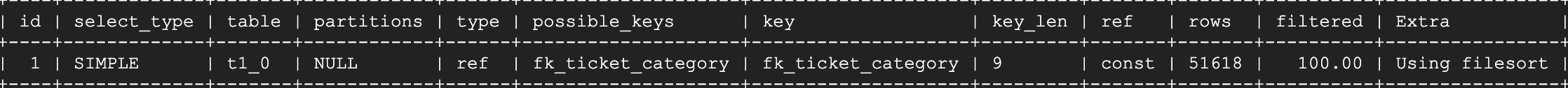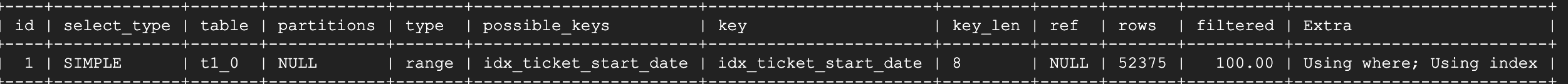 - idx_ticket_start_date 인덱스를 사용해 범위 검색(type = range)이 수행되고 있음.