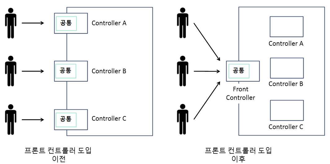 프론트 컨트롤러가 어플리케이션의 요청을 핸들링 해주고, 공통 작업을 처리해주어 중복 코드를 제거할 수 있다는 장점이 있습니다.