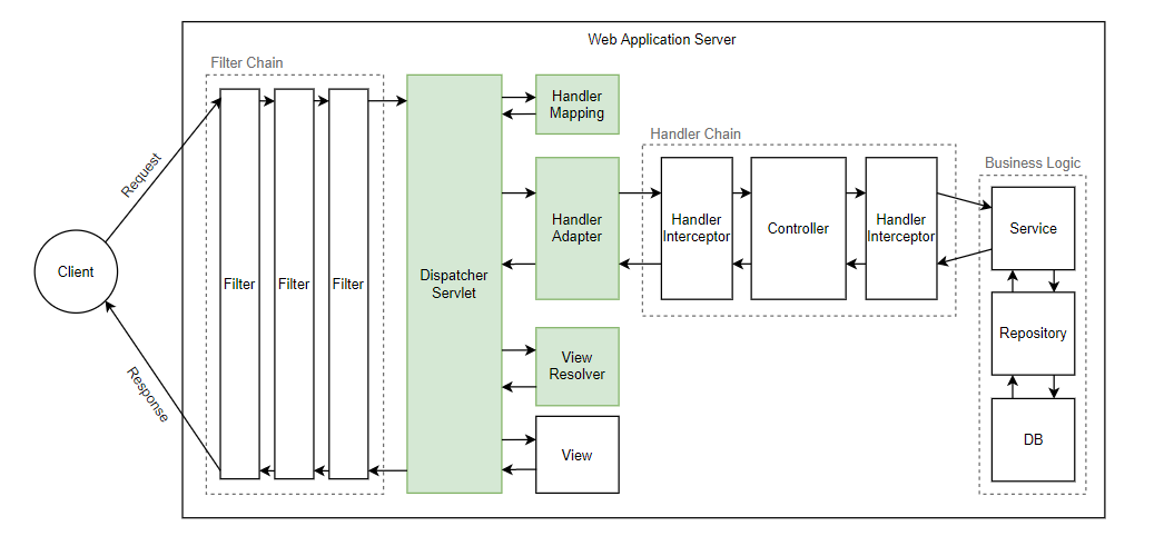 - HandlerAdapter가 Handler를 실행하여 요청을 처리하고 ModelAndView 객체를 반환